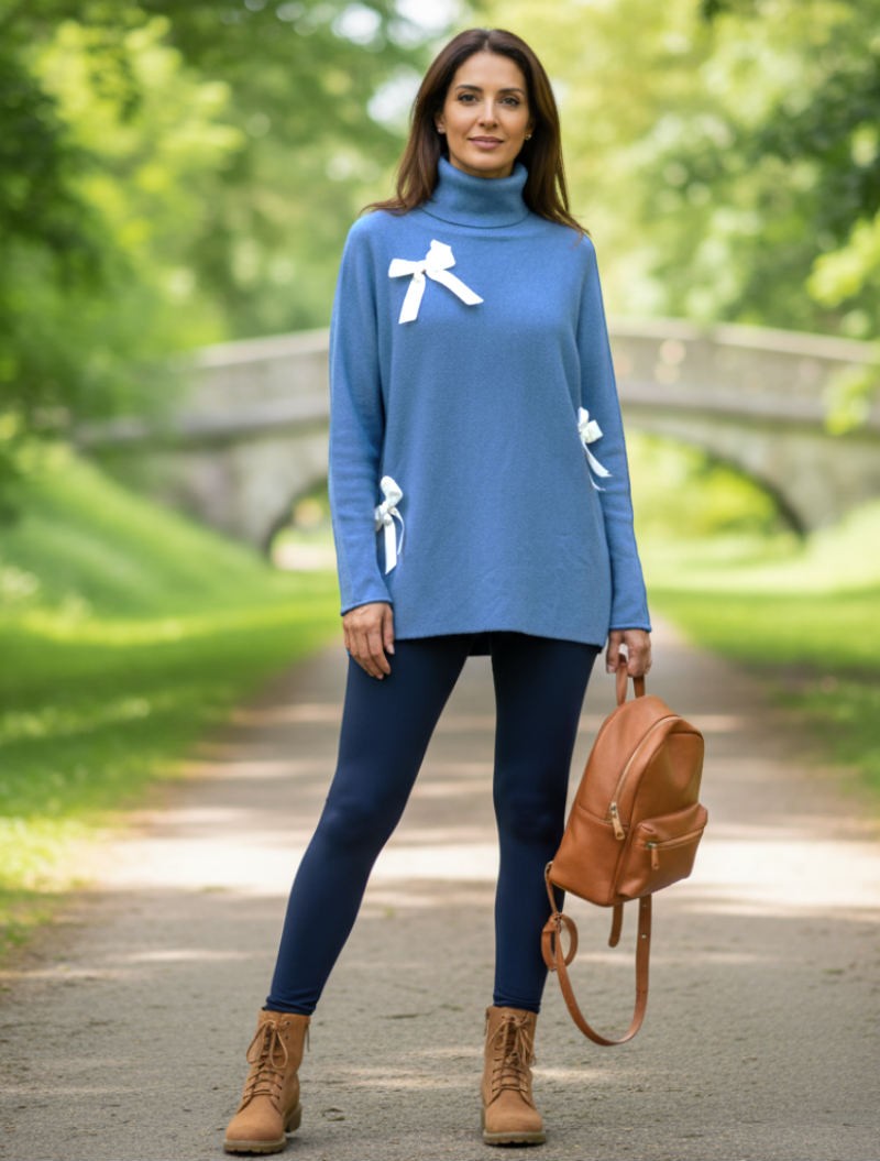 Αγκαλιάζει τον λαιμό με έναν ελαστικό και ζεστό τρόπο, προσφέροντας προστασία από το κρύο, ενώ τα φιογκάκια, που είναι αποσπώμενα, προσθέτουν μια παιχνιδιάρικη και ρομαντική αίσθηση στο σχέδιο.