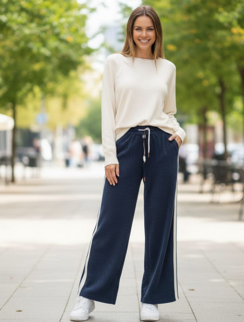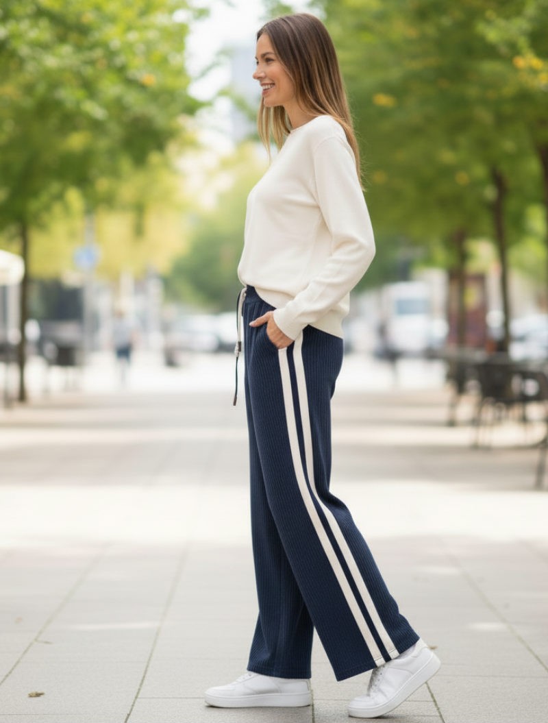 Άνετη και κομψή κοτλέ παντελόνα σε μπλε χρώμα, με  ρίγες στο πλάι που προσθέτουν μοντέρνο και αθλητικό χαρακτήρα.