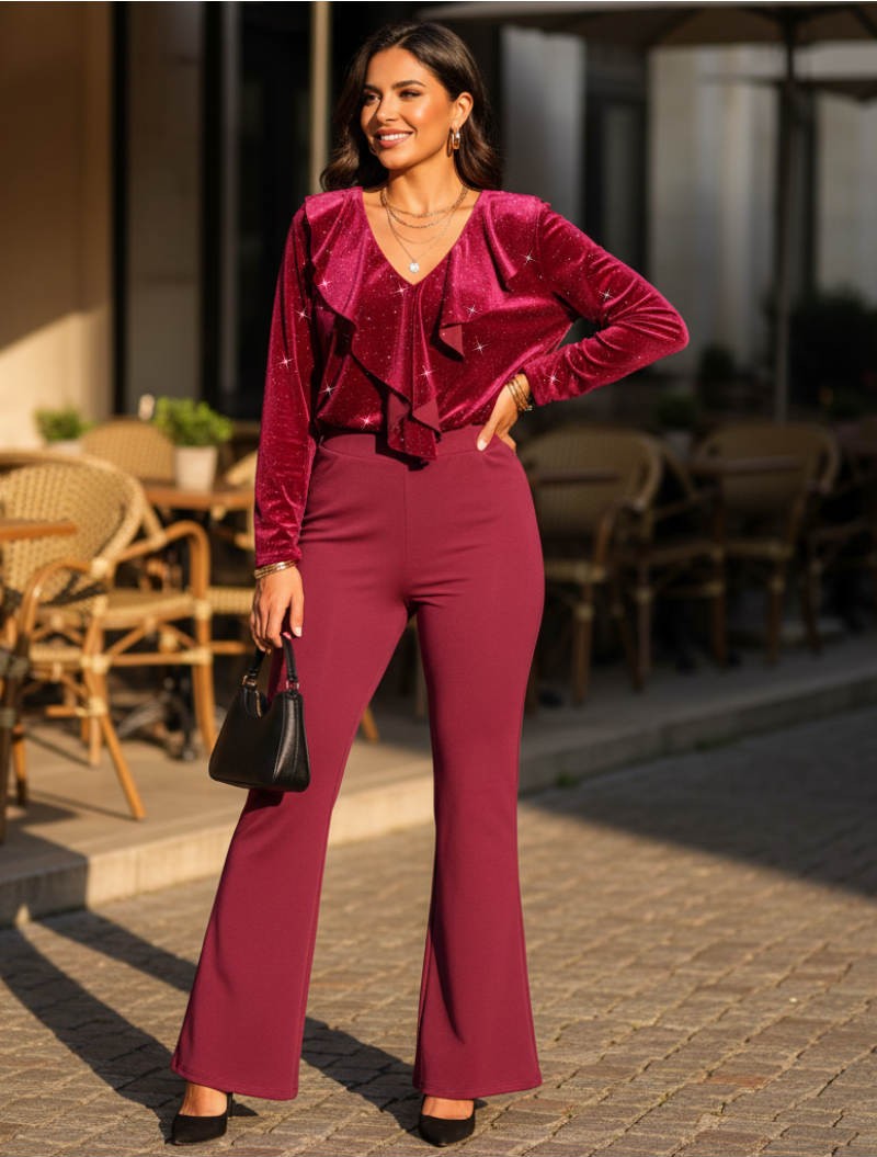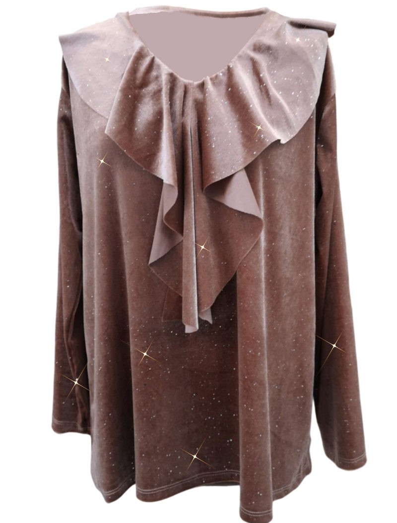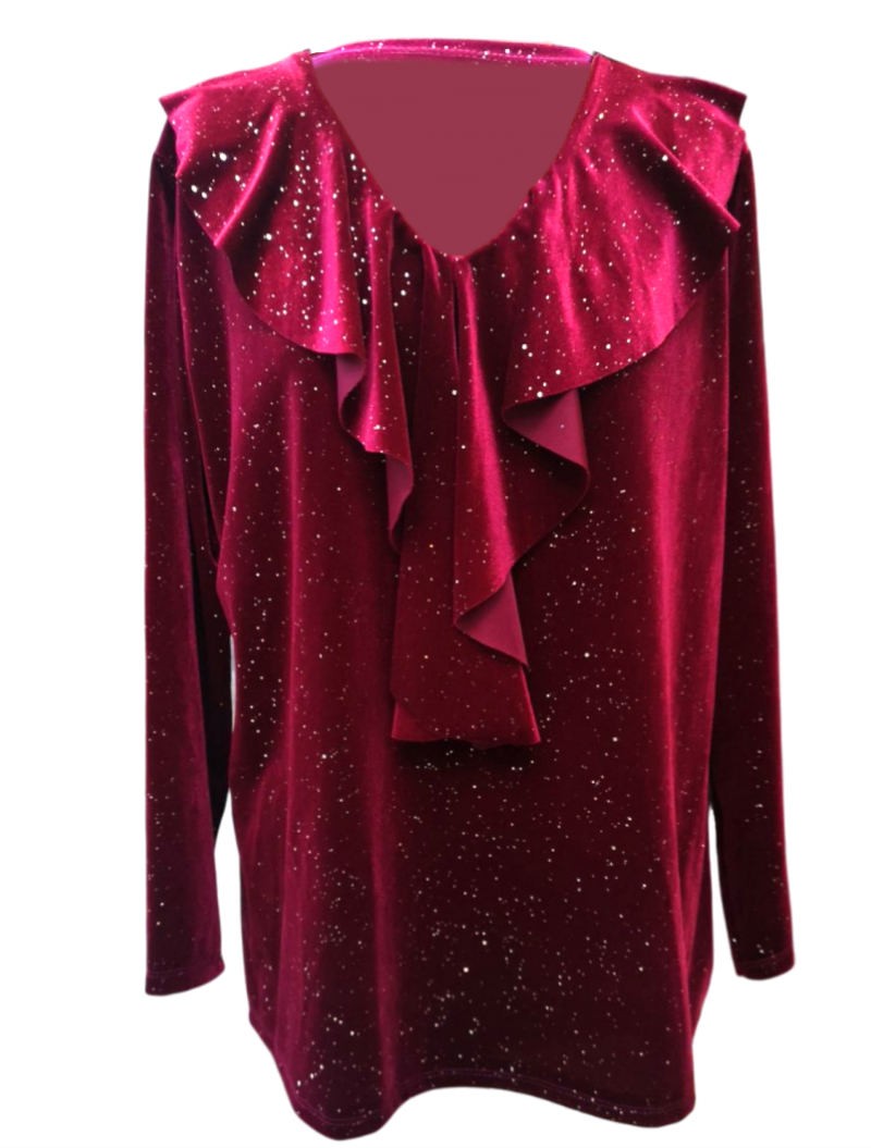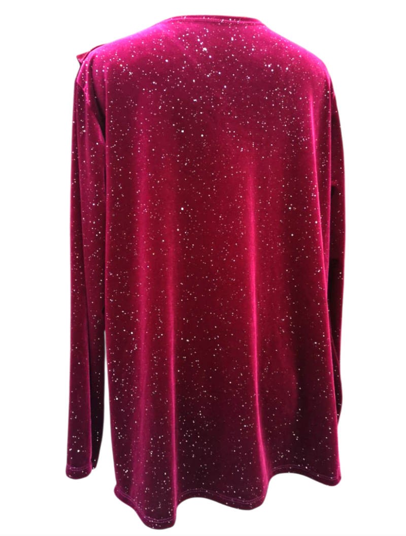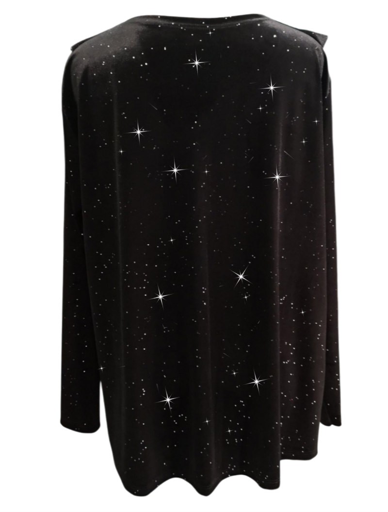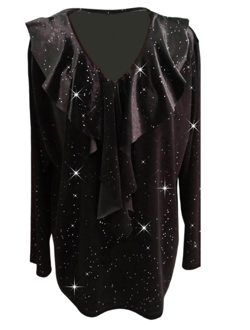 Εντυπωσιακή μπλούζα από απαλό βελούδο με λαμπερές ασημί πιτσιλιές που χαρίζουν διακριτική λάμψη και elegant χαρακτήρα.Ιδανική επιλογή για βραδινές εξόδους, γιορτινές εμφανίσεις αλλά και chic καθημερινά σύνολα.