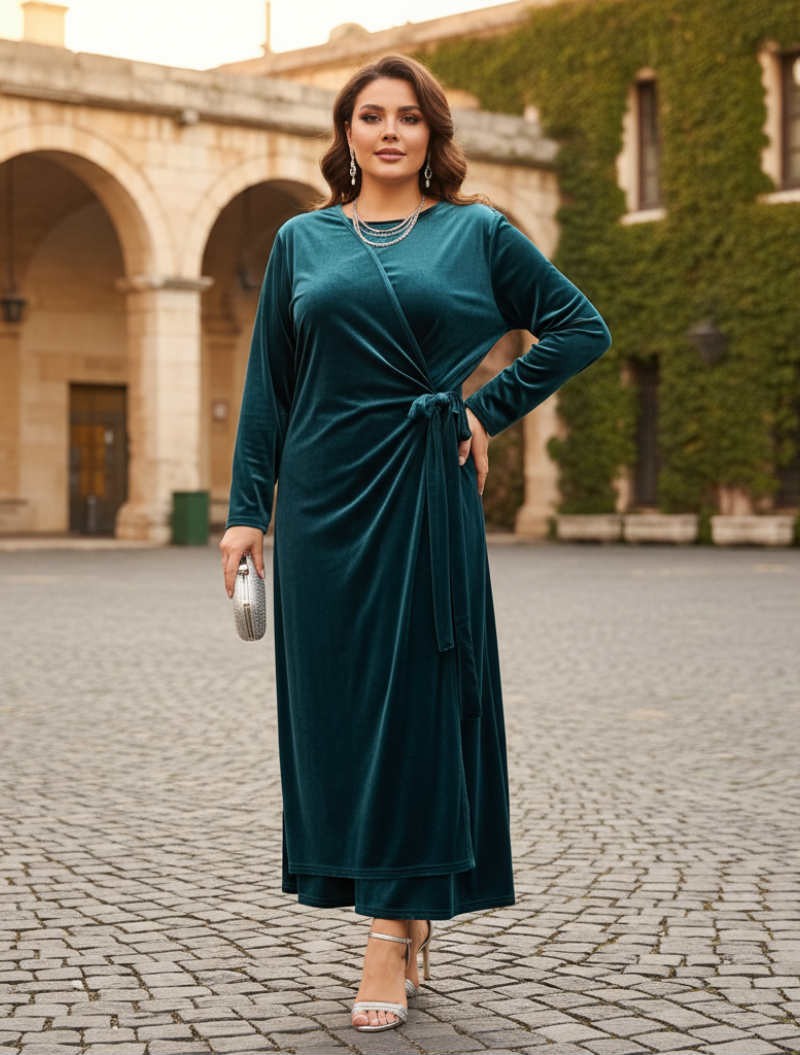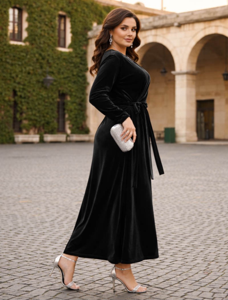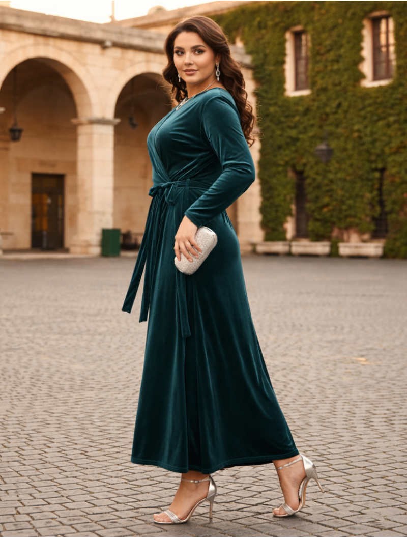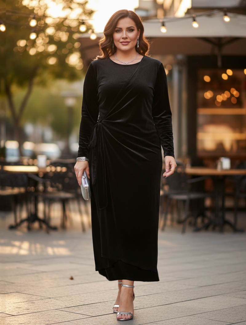 Το φόρεμα που συνδυάζει διαχρονική κομψότητα με απόλυτη άνεση.Η βελούδινη υφή του χαρίζει πολυτελή αίσθηση,ενώ το κρουαζέ σχέδιο με δέσιμο στη μέση αγκαλιάζει όμορφα τη σιλουέτα και κολακεύει τον juicy σωματότυπο.